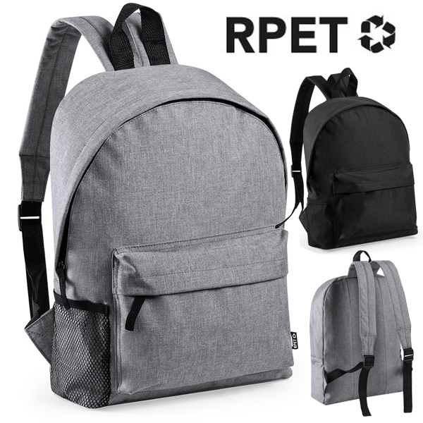 Mochila en resistente 600D RPET, elaborado a partir de plástico reciclado, para así fomentar la reutilización de residuos plásticos y ayudar a la sostenibilidad del planeta. Con cierre de cremallera y bolsillo en frontal, esquinas reforzadas, tiradores con cinta para fácil apertura y accesorios en color negro. Espalda y cintas de hombros acolchadas y ajustables. Distintivo RPET en etiqueta, Parte Trasera y Cintas Acolchadas