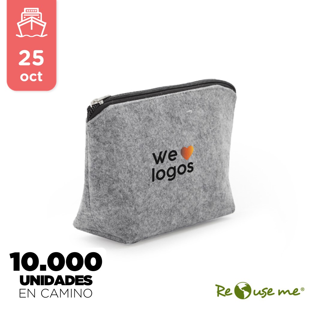 Neceser de fieltro RPET en color gris. El producto viene en una bolsa de PLA 100% biodegradable. Dimensiones: 22 x 14 x 6,5 cm. Reuseme.