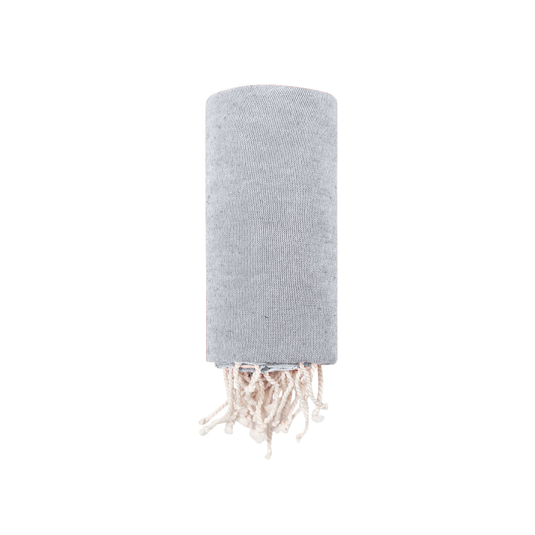 Pareo toalla de 180g/m2 en combinación de algodón reciclado y RPET. El material RPET se elabora a partir de plástico reciclado, para así fomentar la reutilización de residuos plásticos y ayudar a la sostenibilidad del planeta.
