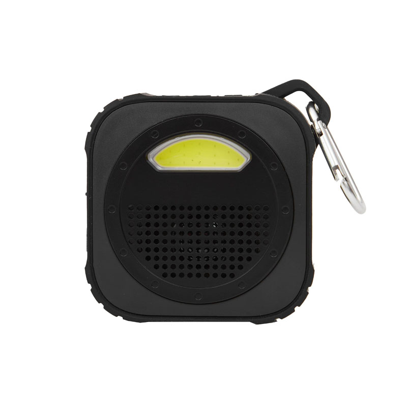 Parlante Bluetooth, con luz de 5V. Cuenta con gancho para transportarlo. Está realizado en ABS y silicona. Batería: 600mah. Medidas: 9 x 9 x 3,3 cm. Tahg