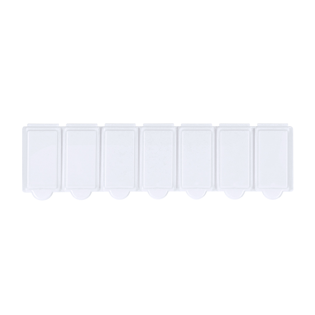 Pastillero semanal en resistente material PP de acabado blanco sólido. Incluye 7 compartimentos individuales con cierre de seguridad. Libre de BPA. 7 Compartimentos