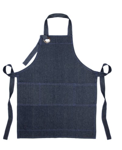 Delantal, pechera de mezclilla azul. Cuello ajustable amarra y tirantes en la cintura que permiten un ajuste fácil, amplio bolsillo central dividido