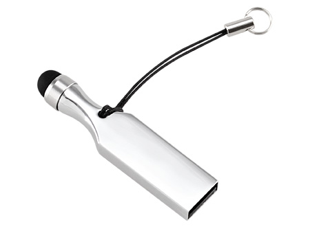 USB Pen Drive metálico de 8 GB de capacidad, con puntero Touch-Screen y cordón para colgar. Presentación en estuche de Aluminio con ventana.