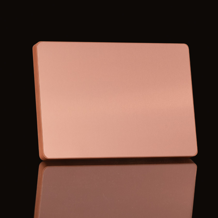 Placa metálica color cobre, modelo "BLOCK", montada sobre base rectangular de madera enchapada con esquinas redondeadas. En su parte posterior, incluye orificios y soporte metálico para exhibición vertical u horizontal. Presentación en caja de cartón forrado negro con cierre imantado, interior acolchado de espuma y tela poliéster satinado negro, con troquel. OJO: la placa metálica viene con film plástico removible, para protección de la misma.
