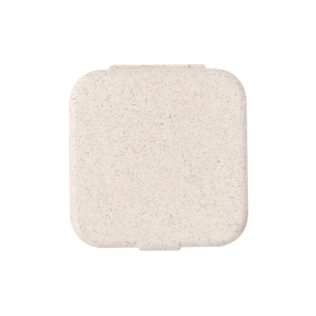Útil portaclips fabricado en caña de trigo. Con cierre a presión y elaborada a partir de elementos reciclados, con 50 clips en su interior. La caña de trigo fomenta la utilización de materias primas naturales, reduciendo así las emisiones contaminantes. 50 Clips Incluidos