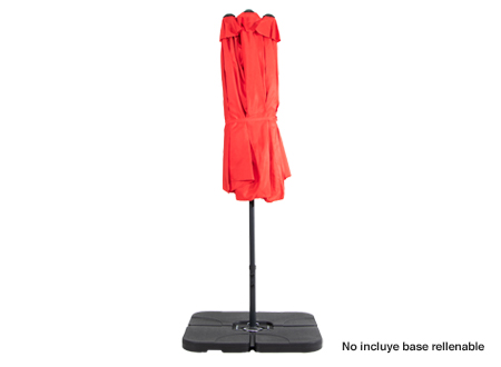 Quitasol ovalado doble de 4.55 x 2.7 m, modelo "Twins", con 12 cascos de lona Poliéster UV impermeable de 180g. Contiene varas reforzadas de Acero recubierto de 12 x 18mm, asta de Acero recubierto de 48mm, sistema de apertura automático con manivela.