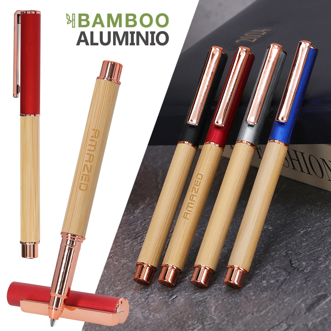 Elegante roller fabricado en bambú y aluminio. Con clip metálico, empuñadora y detalles de acabado oro rosa, caña fabricada en bambú y tapadera en aluminio. Con cartucho jumbo, en tinta azul y con cierre de capucha. Carga Jumbo