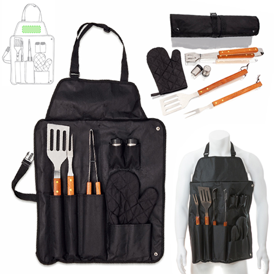 Set de barbacoa de 7 accesorios. Incluye paleta, trinchador y pinzas de acero inox con mango de madera. Con manopla acolchada y botes dosificadores para sal y pimienta. Presentado en estuche de resistente poliéster 600D en color negro con cierre de botones metálicos. Con cinta de transporte ajustable con cierre de clic en resistente nylon. 7 Accesorios