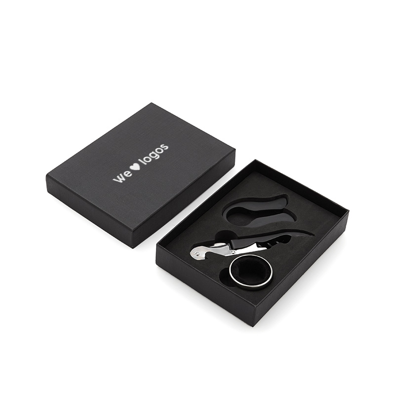 Set de vinos en estuche de cartón negro. Contiene, Sacacorchos de dos tiempos, navaja y collar cortagota.
