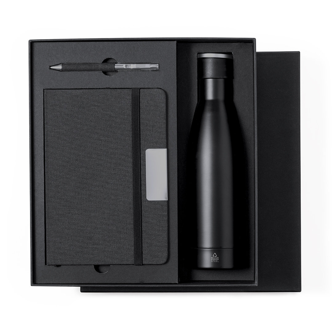 Elegante set premium que incluye: Termo de doble capa en Acero Inox Reciclado de acabado negro mate y de 500 ml de capacidad, con asa rígida de metal color plata mate. Con logotipo acero inox. Bloc de notas en RPET en elegante color negro, con detalle metálico especial para marcaje en láser. Incluye cierre elástico y marcapáginas de tela. Interior con 80 hojas de disposición a una raya. Con logotipo RPET. Bolígrafo en RPET de acabado negro mate, de mecanismo giratorio y tinta azul. Con clip y puntera en pulido metal. Set presentado en estuche individual de acabado mate, con troquelado interior para cada uno de los elementos del set. El material RPET se elabora a partir de plástico reciclado, para así fomentar la reutilización de residuos plásticos y ayudar a la sostenibilidad del planeta. Bidón Térmico Acero Inox Reciclado, 500 ml. Bloc Poliéster 300D RPET, Portada Rígida, 80 Hojas. Bolígrafo Poliéster 300D RPET