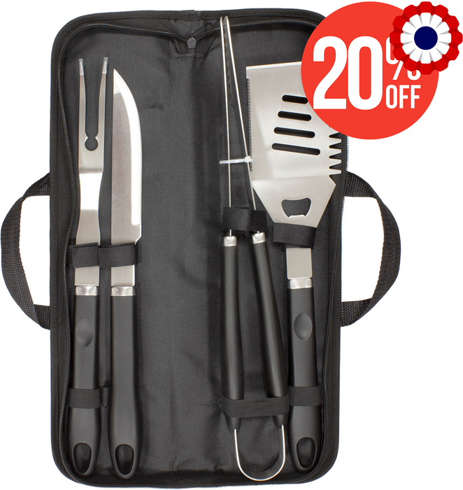 48 x 12,2 x 5,5 cm (estuche cerrado). Acero inoxidable 420. Set de 4 utensilios: tenedor y cuchillo de 41 cm, pinza de 44,5 cm y espátula de 40 cm de largo, todos con mango plástico en color negro. Estuche de nylon 600 D color negro con cierre. Calidad Premium.