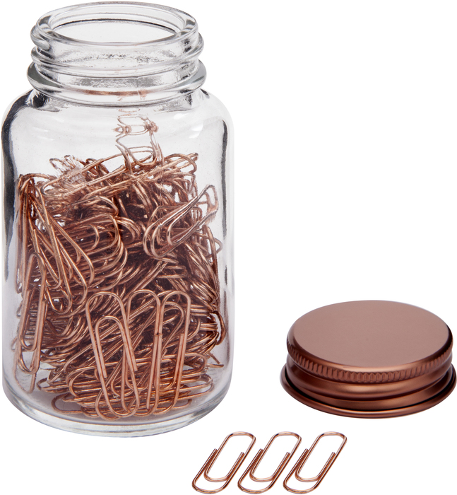 Ø 4,5 x 8,5 cm. Vidrio y metal. Set de clips metálicos en frasco de vidrio con tapa metálica.