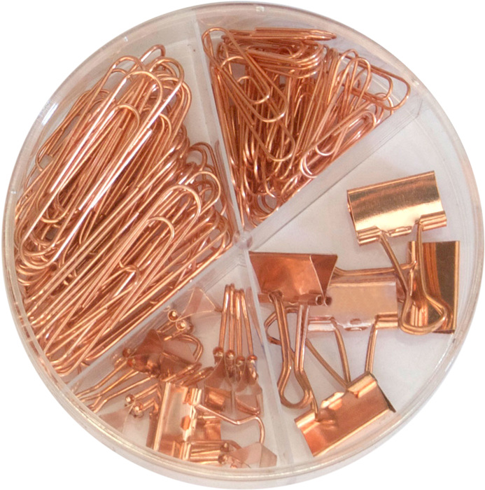 Ø 10 x 2,6 cm. Plástico. Set de clip y sujeta papeles color cobre en estuche con 4 divisiones. 5 sujeta papeles de 1,9 cm. 8 sujeta papeles 1,5 cm. 30 clip 5 cm. 70 clip 2,8 cm. Estuche contenedor con cuatro divisiones.