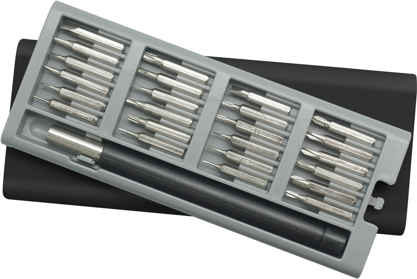 16,5 x 6,8 x 1,8 cm. Plástico y Acero. Mango con punta imantada con 24 puntas diferentes. La caja viene con cuatro compartimentos imantados que permiten mantener ordenadas las diferentes puntas. La caja contiene apertura push.