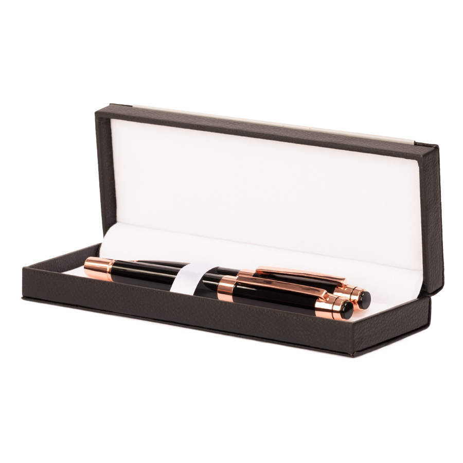 Set de Escritura "THORTON", incluye Bolígrafo metálico negro con terminales encobrizados + Roller pen metálico negro con terminales encobrizados. Presentación en elegante estuche de PU negro con ribete metálico plata opaco bruñido, interior cuna aterciopelada blanca. Sobre funda de papel color negro..