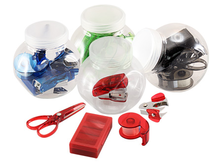 Set de oficina en frasco plástico transparente con tapa frozen. Ideal espacio para logo en tapa.