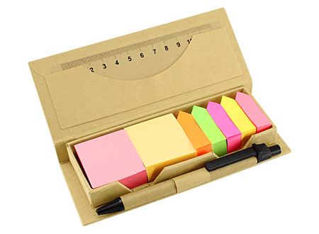 Memo Set Ecológico con Bolígrafo Ecológico escritura negra, Regla 12 cm, notas y banderitas adhesivas. Incluye 300 notas adhesivas cuadradas + 750 banderitas adhesivas de colores.