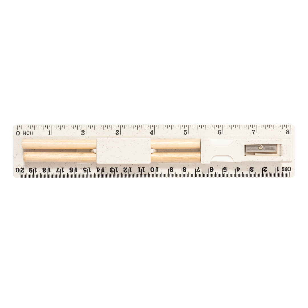 Set de 5 piezas fabricado en caña de trigo. Incluye 2 lápices de madera con mina negra y cuerpo cilíndrico blanco; goma y sacapuntas. Presentado en estuche/regla de 20 cm/8 pulgadas, con compartimentos para los distintos elementos del set. Presentado individualmente en una bolsa de papel blanca. La caña de trigo fomenta la utilización de materias primas naturales, reduciendo así las emisiones contaminantes. 5 Piezas