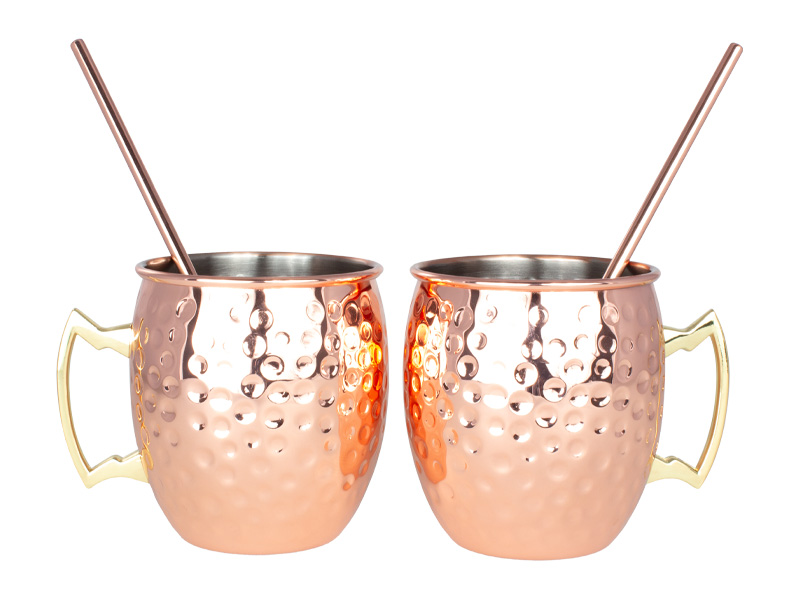 Set "Moscow Mule" encobrizado, incluye 2 tazones 250cc. c/u + 2 bombillas de Acero Inoxidable, en color cobre, presentación en caja de carton color negro.