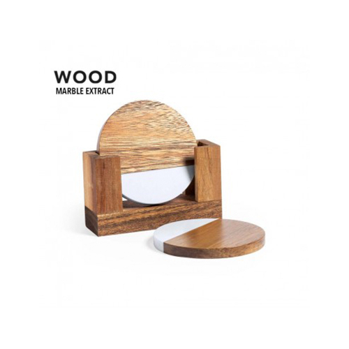Elegante set de posavasos premium. Fabricado en combinación de materiales naturales: madera de acacia con detalle en extracto de mármol. Incluye 2 piezas, con soporte a juego en madera de acacia. Presentado en caja individual de diseño kraft. 2 Piezas