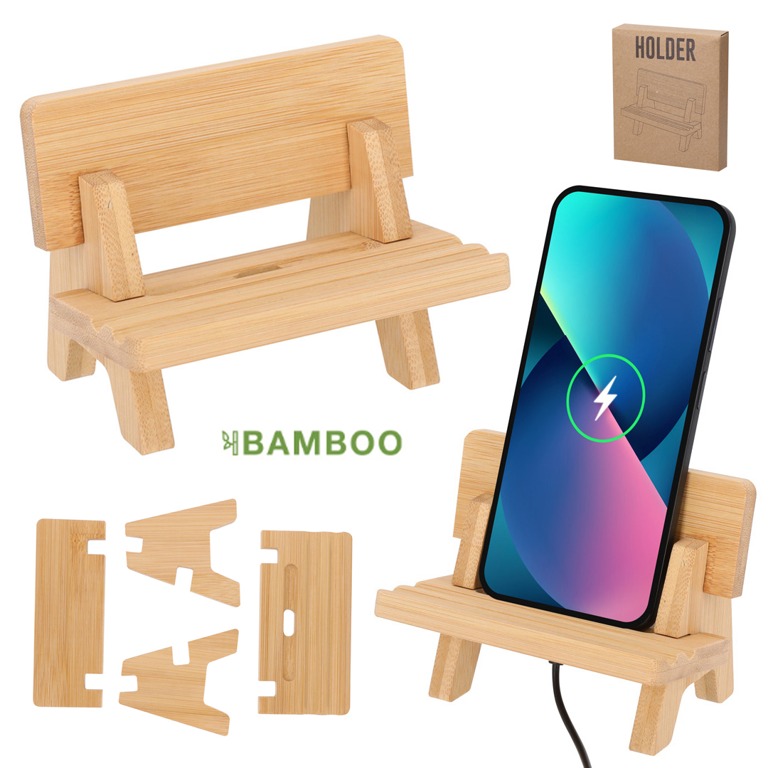 Soporte para dispositivo móvil en original forma de banco, fabricado en resistente Bambú. Con piezas desmontables que permiten 3 posiciones diferentes del dispositivo. Incluye ranura para el cable de carga, permitiendo cargar el dispositivos miestras está en el soporte.Materiales como el Bambú fomentan la utilización de materias primas naturales reduciendo las emisiones contaminantes. Además, el Bambú proviene de una planta de gran resistencia y versatilidad, con crecimiento y regeneración rápida, siendo una excelente alternativa al uso de madera tradicional.