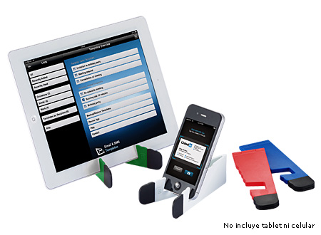 Soporte plástico abatible para iPad y Celular, con goma antideslizante en ambos terminales.