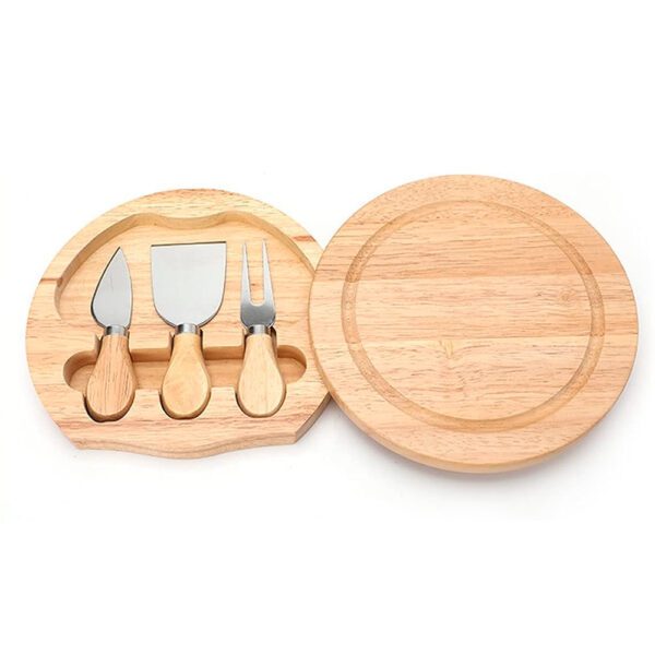 Tabla redonda retráctil de madera sólida de ROBLE, con canaleta circular. Contiene 3 herramientas para cortar y servir Quesos, en compartimento inferior retráctil. Madera trabajada y acabada en máquina, de forma 100% regular, con superficies y cantos lisos y suaves, para una mayor higiene y comodidad al momento de cortar y servir los quesos.
