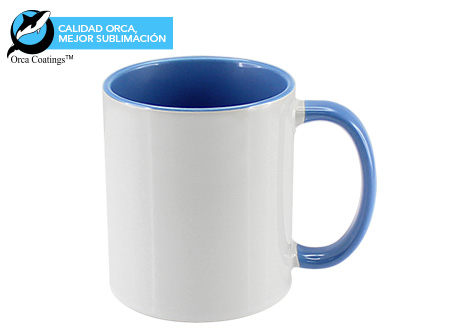 Tazón Cerámico blanco con interior y asa de color, cobertura exterior con polímero especial marca ORCA COATINGS(R) para una sublimación de primera calidad. Cada unidad se entrega dentro de su caja individual de cartón blanco.