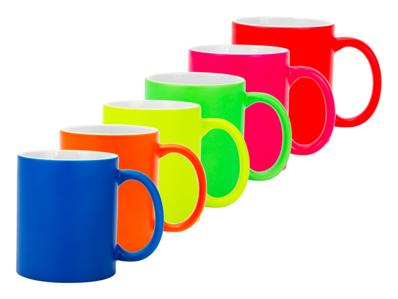 Tazón cerámico de 11oz (325cc) con superficie exterior de color fluorescente, interior blanco, para Sublimación. Producto de calidad superior ORCA. Presentación en bolsa plástica translúcida + caja de cartón blanco.