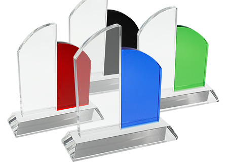 Deluxe Trofeo grande de Cristal modelo "Catedral" con aplicación de cristal-color. Presentación en caja de cartón forrado negro.
